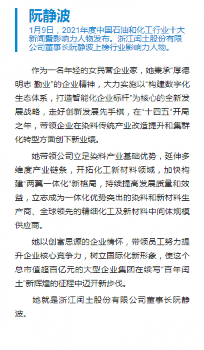 2022年1月9日,由中國(guó)石油和化學(xué)工業(yè)聯(lián)合會(huì)指導(dǎo),《中國(guó)化工報(bào)》社有限公司主辦的“2021年度石油和化工行業(yè)十大新聞暨影響力人物發(fā)布盛典”采用線上直播的形式舉行。浙江閏土股份董事長(zhǎng)阮靜波榮膺“2021年度中國(guó)石油和化工行業(yè)影響力人物”。