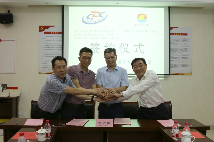 儀式上,浙江省疾控中心樓曉明副主任,紹興市疾控中心支部書記孟海濱,上虞區疾控中心書記方海平主任與公司黨委副書記阮興祥同志共同簽署四方聯建協議書。