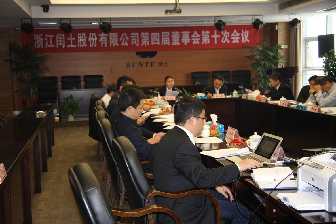 4月25日,浙江閏土股份有限公司第四屆董事會第十次會議在閏土大廈召開。本次會議由阮靜波董事長主持。阮靜波董事長、徐萬福總經理在會上分別作了工作報告,其他董事作了相關發言。